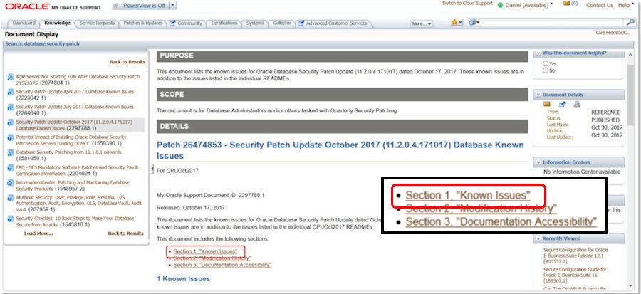 | Consider the page from MyOracleSupport at the right. At the bottom of the page, highlighted in red, is the "Known Issues" section. If you want to attack Oracle Databases it is remarkably helpful to learn about issues that you know most of Oracle's customers won't patch for weeks or months: An issue highlighted at OpenWorld 2016 by Larry Ellison during one of his keynotes. |