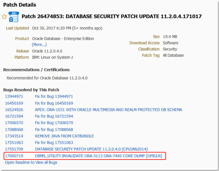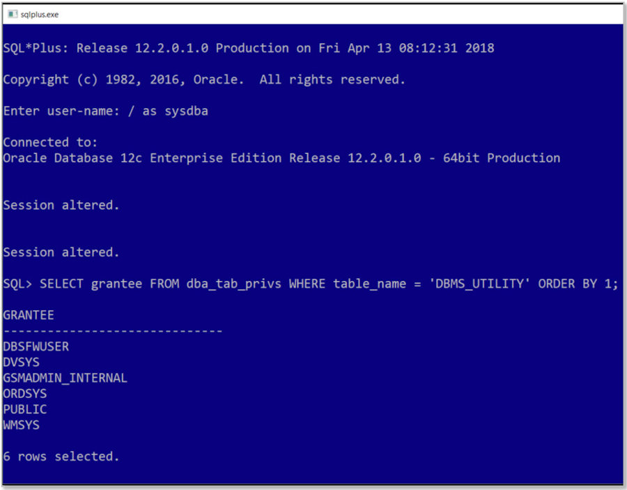 | Nothing on this page is intended to be critical of Oracle. We wish we could say the same of many of Oracle's customers whose IT processes and procedures make hacking easy. What Oracle needs to correct is that almost none of the functionality in the DBMS_UTILITY package belongs in the hands of a user that does not have escalated privileges. EXECUTE on the DBMS_UTILITY package should be responsibly granted to applications or to members of the DBA team but not to everyone with a user-id. Oracle has partially mitigated the risk by definubg DBMS_UTILITY with AUTHID DEFINER. With AUTHID DEFINER, a user with the EXECUTE privilege granted on an object cannot invalidate it with DBMS_UTILITY.INVALIDATE which will protect objects like STANDARD from the average user with the CREATE SESSION privilege. Unfortunately, a lot of applications are poorly designed and users that connect do so directly to the application schema. If you have an application like this then the application's PL/SQL objects can be taken out by any user with access to a command line tool or that can execute a SQL Injection attack. |