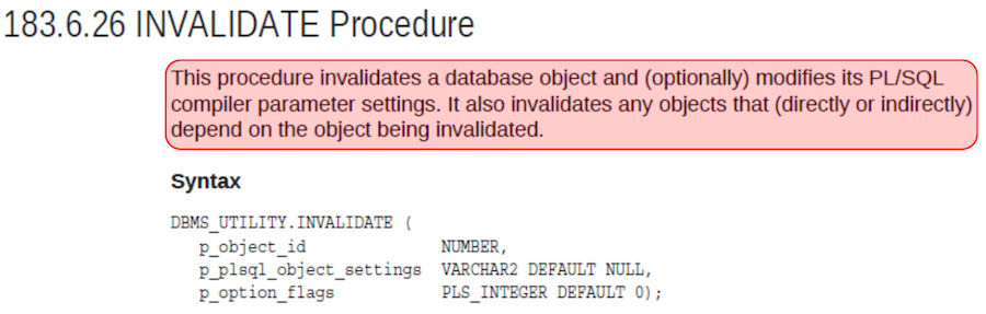 | So the first thing we did after identifying a possible avenue of attack is learn more about DBMS_UTILITY and the INVALIDATE procedure. We discovered, for example, we only needed the OBJECT_ID to invalidate it. That would be easy to get. |