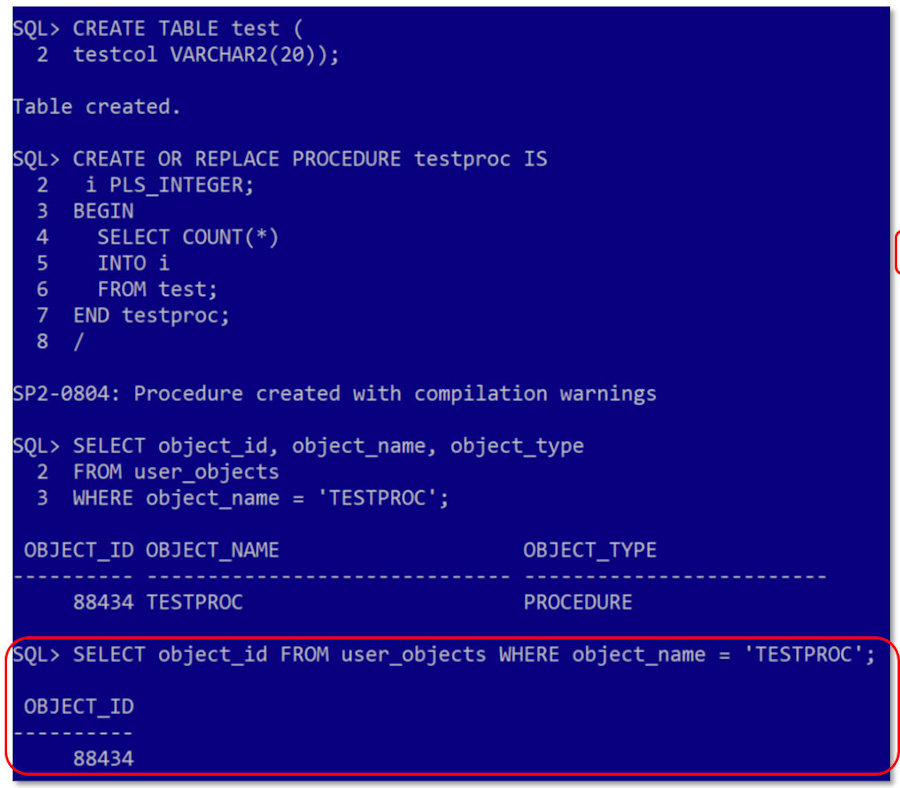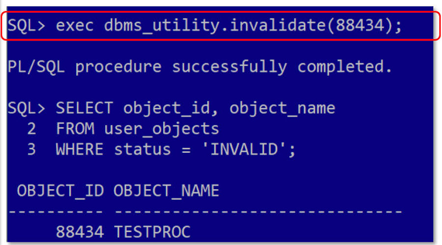 | With a single line of code, highlighted in the red box we invalidated the stored procedure. We validated that TESTPROC was invalid by querying user_objects. And noted that if TESTPROC had also had dependent objects they too would have been invalidated. |
